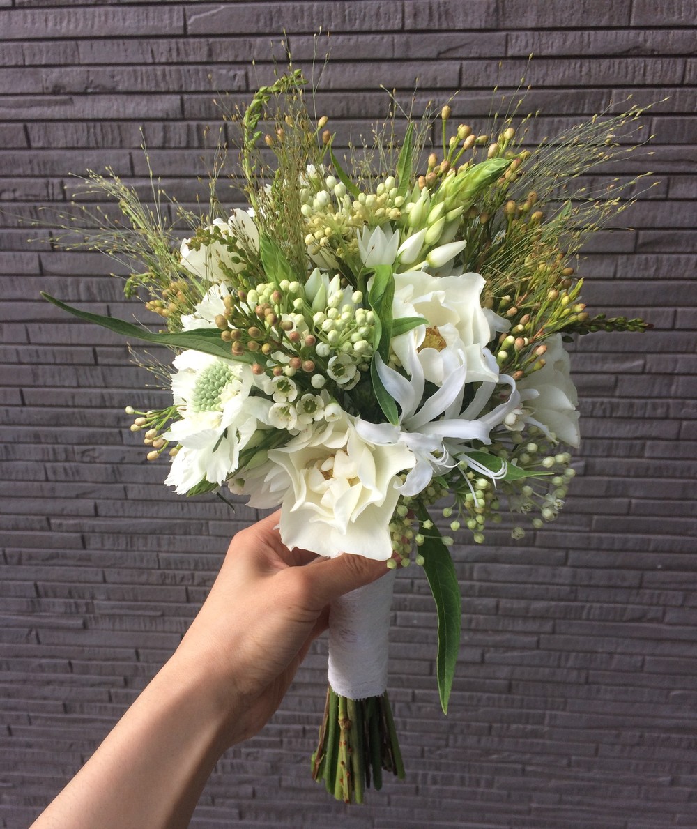 화이트컬러와 그린소재가 살짝 들어간 화이트내추럴 부케입니다.