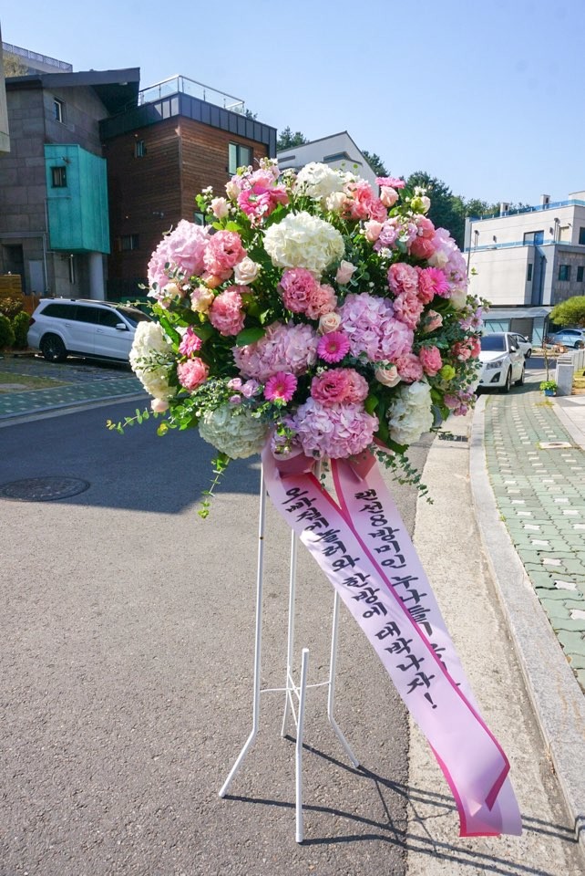 다른 화환과 비교해 보시면, 리본이 좀 더 넓어서 글씨가 큼지막하게 프린트된 걸 보실 수 있으실거예요~