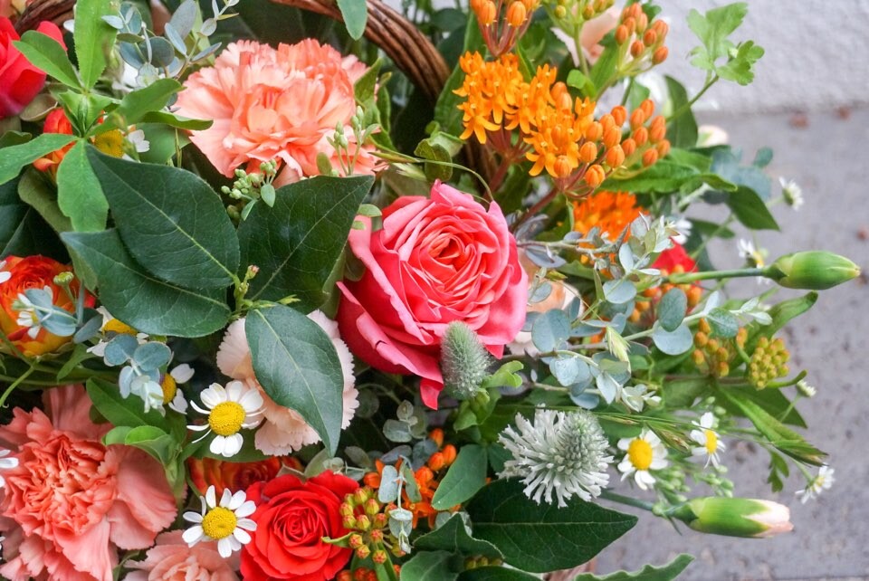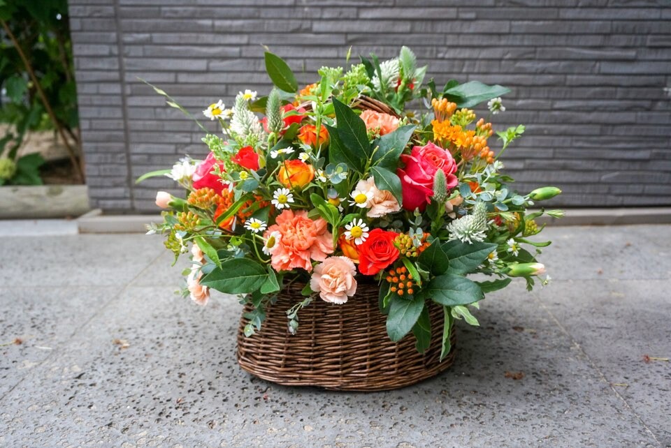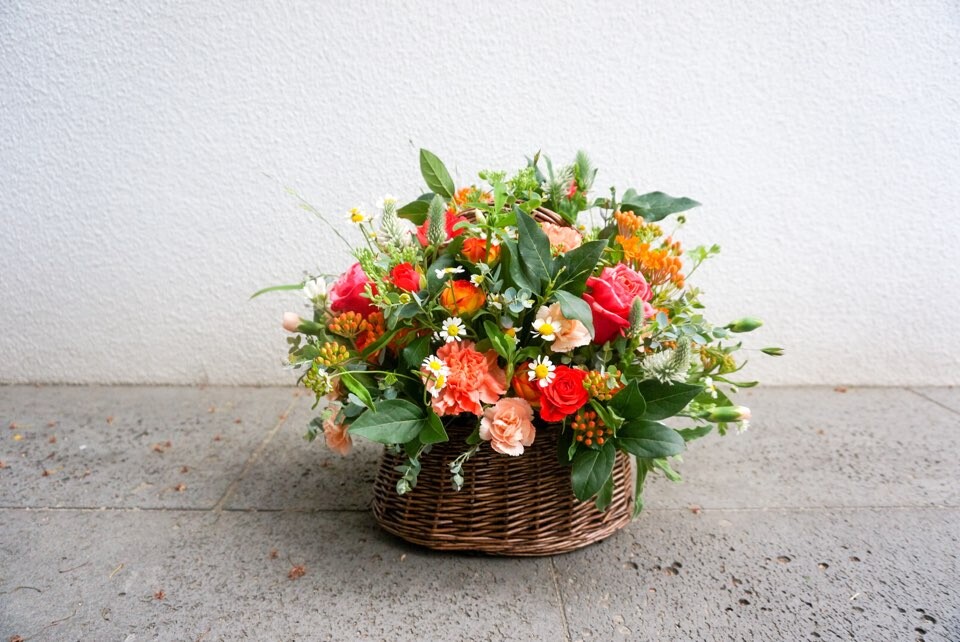 오렌지 카네이션과 잘 어울릴만한 컬러들로 구성되어 화려한 꽃바구니가 되었네요!