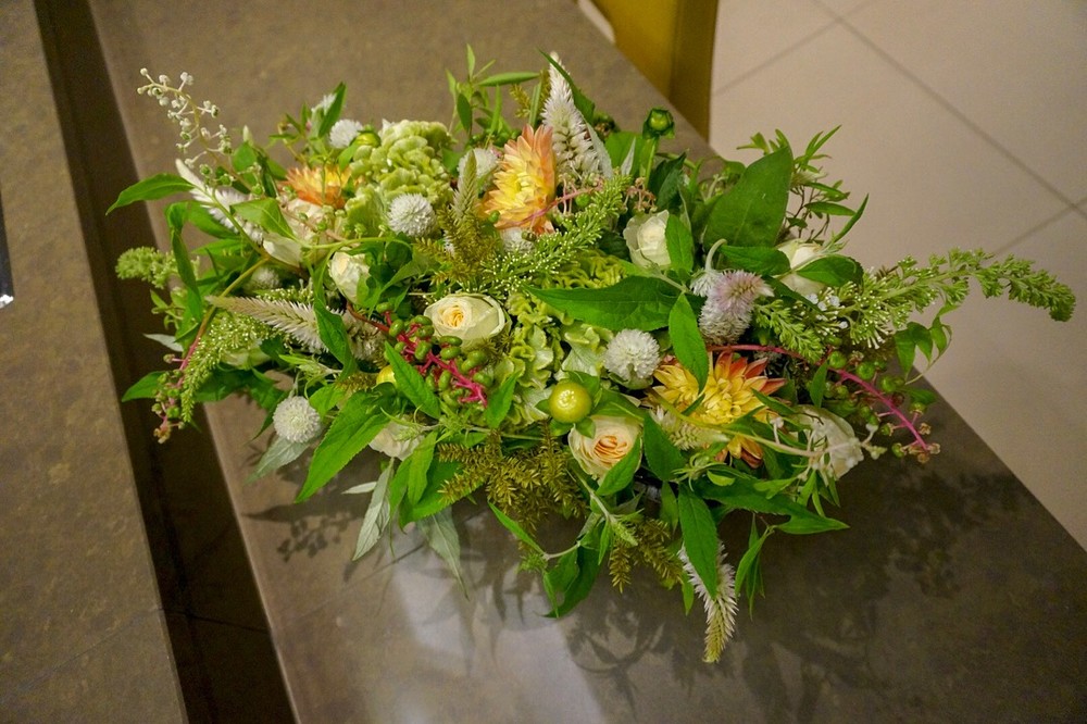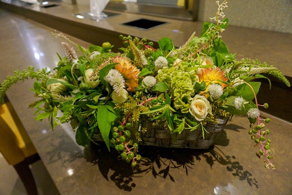 여름 소재 중 하나인 자리공으로 예쁜 라인을 만들어 주었는데요, 늦봄부터 여름시즌 내내 볼 수 있습니다.