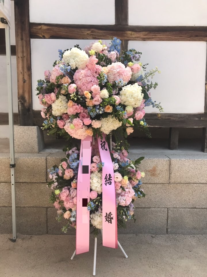 남산골한옥마을에서 날씨 좋은 봄날 결혼식을 축하해주었던 화환입니다.