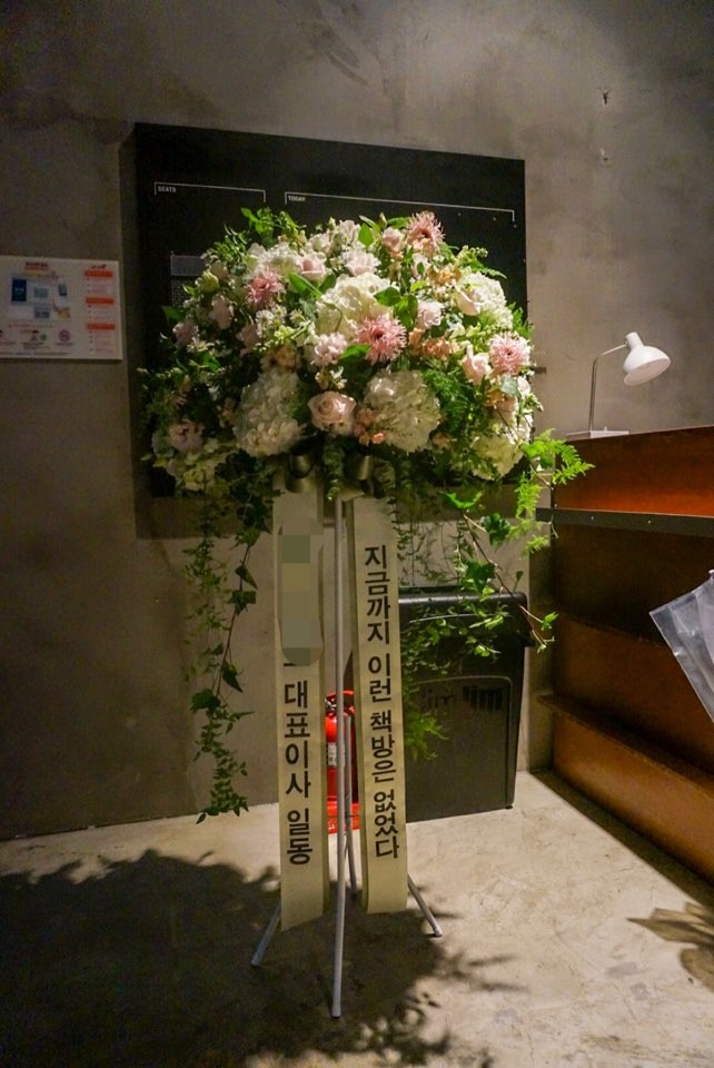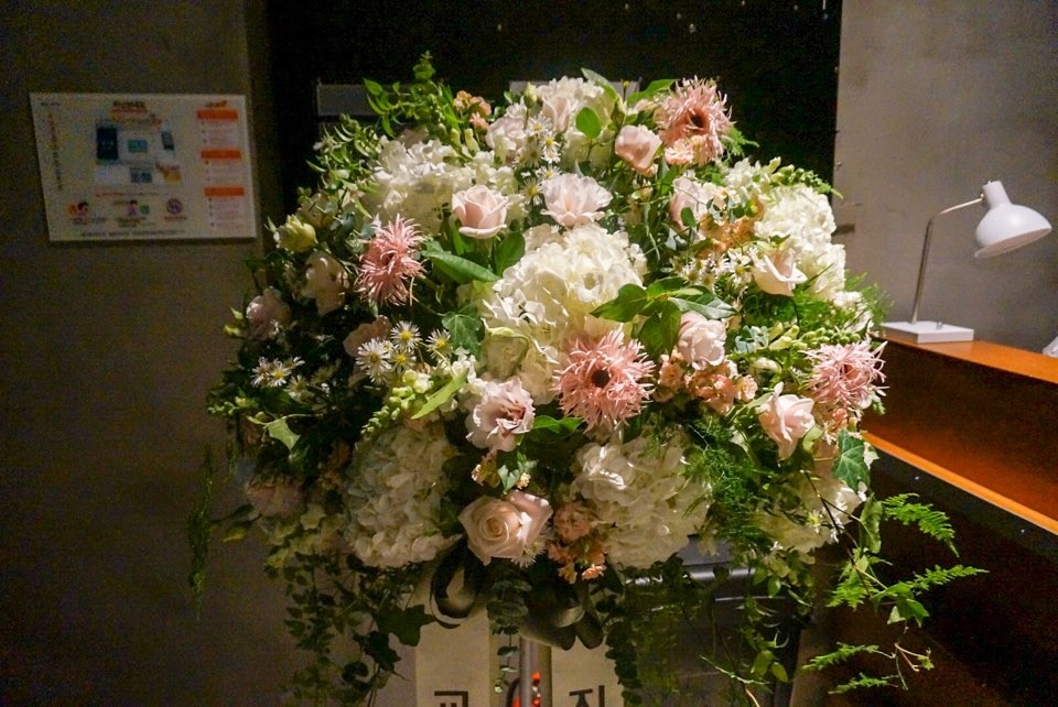 홍대의 한 공연장에 보내진 축하화환으로, 길게 늘어뜨린 그린소재가 포인트인 디자인입니다.
